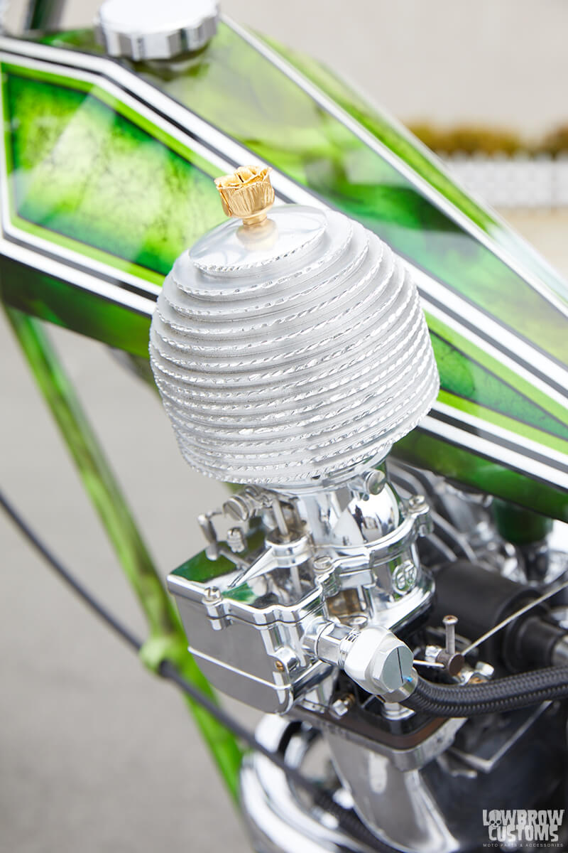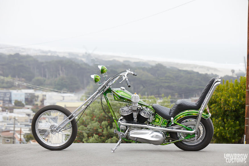 From restoring knuckleheads to building a show choppers for the Born Free show, he hasn’t stopped collecting and building bikes for over 4 decades. Rick says his favorite form is the “Bob jobs”, in between stocker and a chopper. Any given day he has about 4 bikes on the lift and wrenching on them in his chaotically crowded San Fransisco garage.