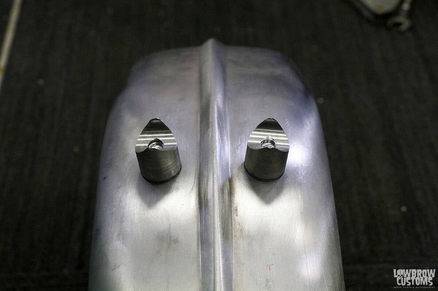 To make sure I had both holes positioned symmetrically on chopper rear fender mounting, I used a transfer punch to mark the position of one bung and then measured the location of the divot from the end of the fender and the side of the fender.