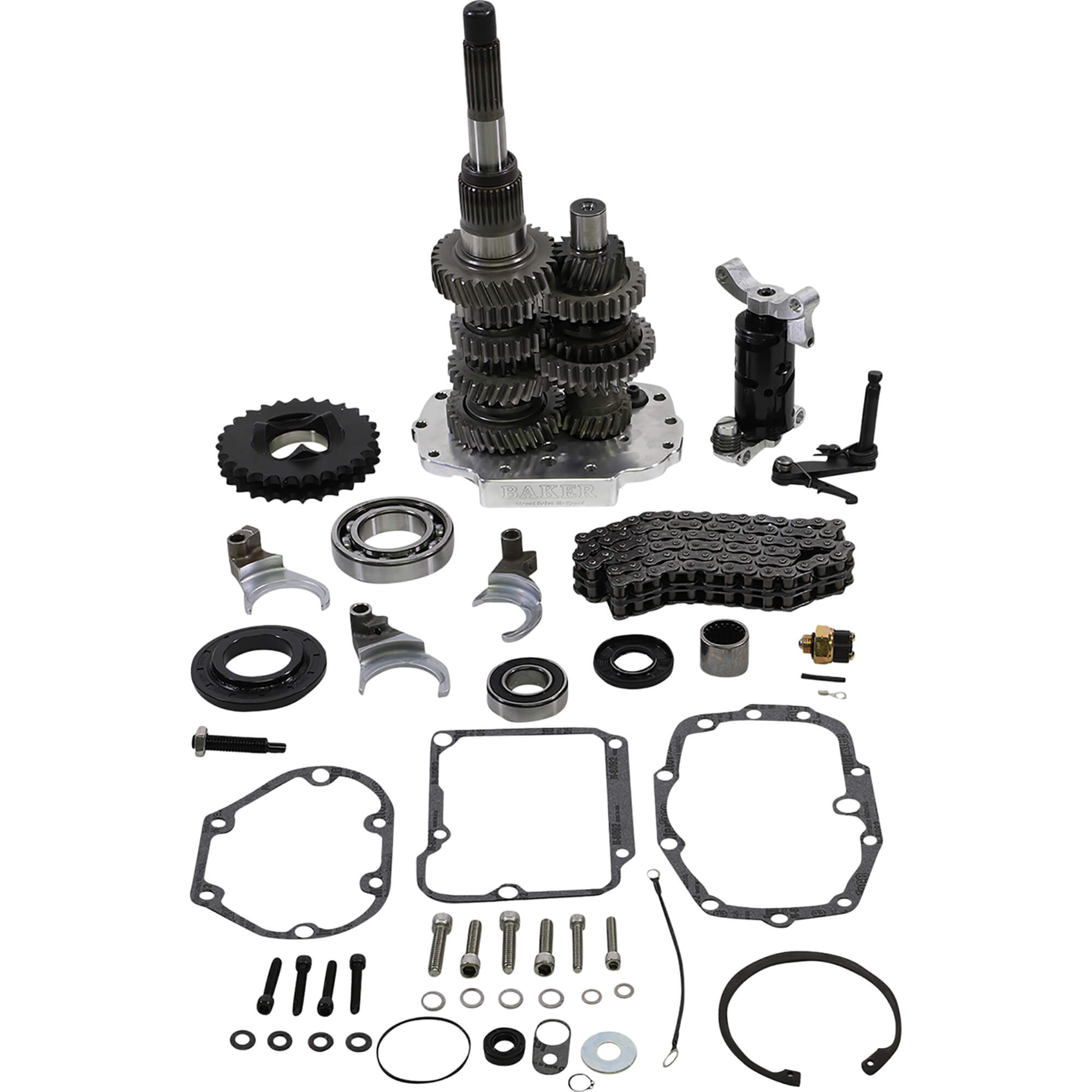 Includes a polished trap door, 6-speed gear set (3.24:1 1st gear/.86:1 6th gear), 28-tooth motor sprocket, longer primary chain, adjusting shoe, fixed spindle-shift drum and anti-overshift ratchet shift pawl assembly