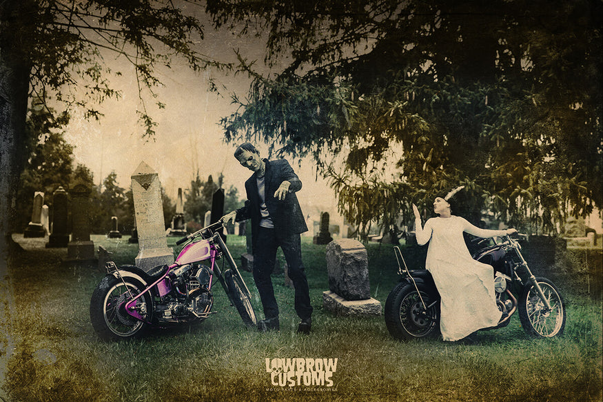 Frankenstein, Bride of Frankenstein and a 1975 Harley chopper. Classic monster stuff.
