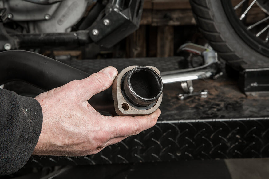 Step 2: Remove retaining rings & flanges from stock exhaust using external lock ring pliers. If the rings are extremely corroded or warped we suggest to use a new set. Re-install the rings and flanges on to the new exhaust. *Note: Make sure the flange goes on first before ring and with the lipped indention facing out.