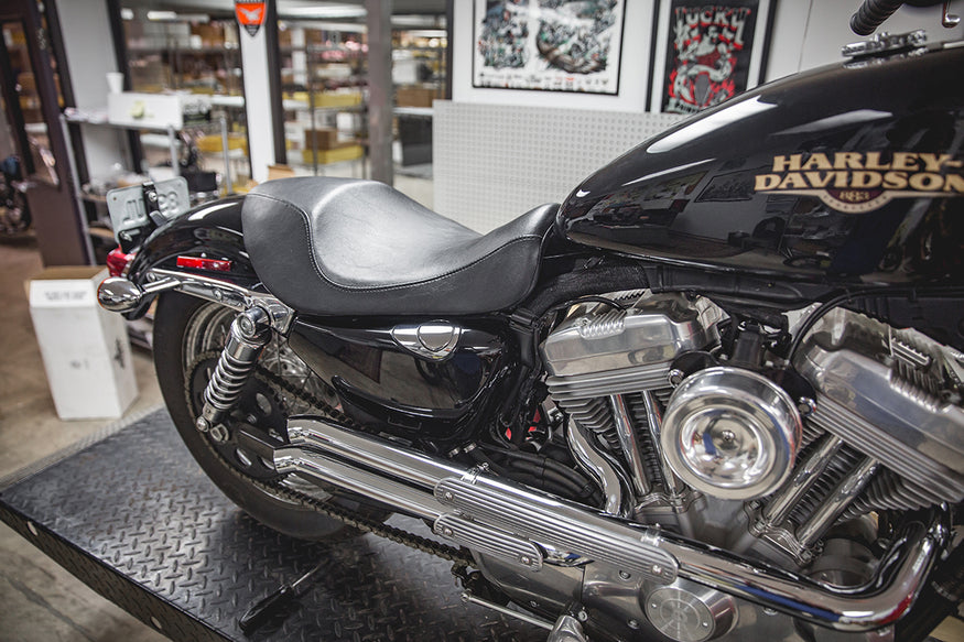 Before installing your new sportster single seat, you'll need to remove the old one. We haven’t shown this process because we don’t know what seat model is on your current model. If there’s a bird’s nest of wires hiding beneath your old seat, tidy up this space before proceeding to step 3. Failure to do proper housekeeping with custom electricals can result in a pinched or severed wire between the seat pan and the frame rails.