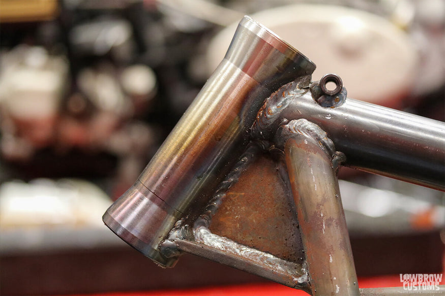 When I started on this build, I decided to go with an aftermarket hardtail frame instead of doing a weld-on Sportster hardtail frame because I wanted to retain my OEM Sportster frame. Then 50 years from now I could restore my ’96 Sportster back to original and sell it for millions of dollars. While that may be a bit farfetched, I thought it would save time going with a pre-built frame because everything would just bolt right up. Well, that dream lasted until I got to the front end and found out that all the time I saved skipping the weld-on hardtail would be used grafting the stock front end to my aftermarket frame.
