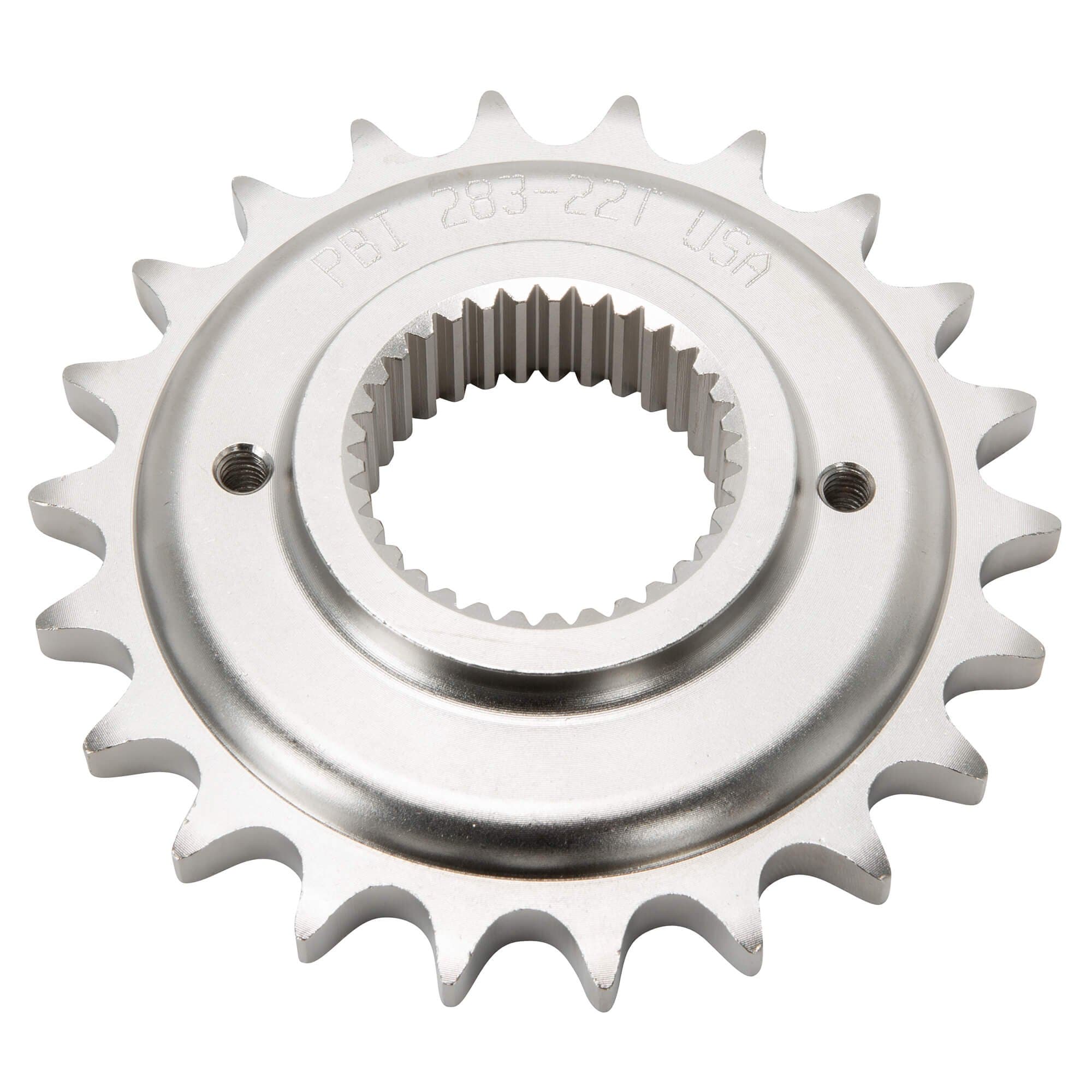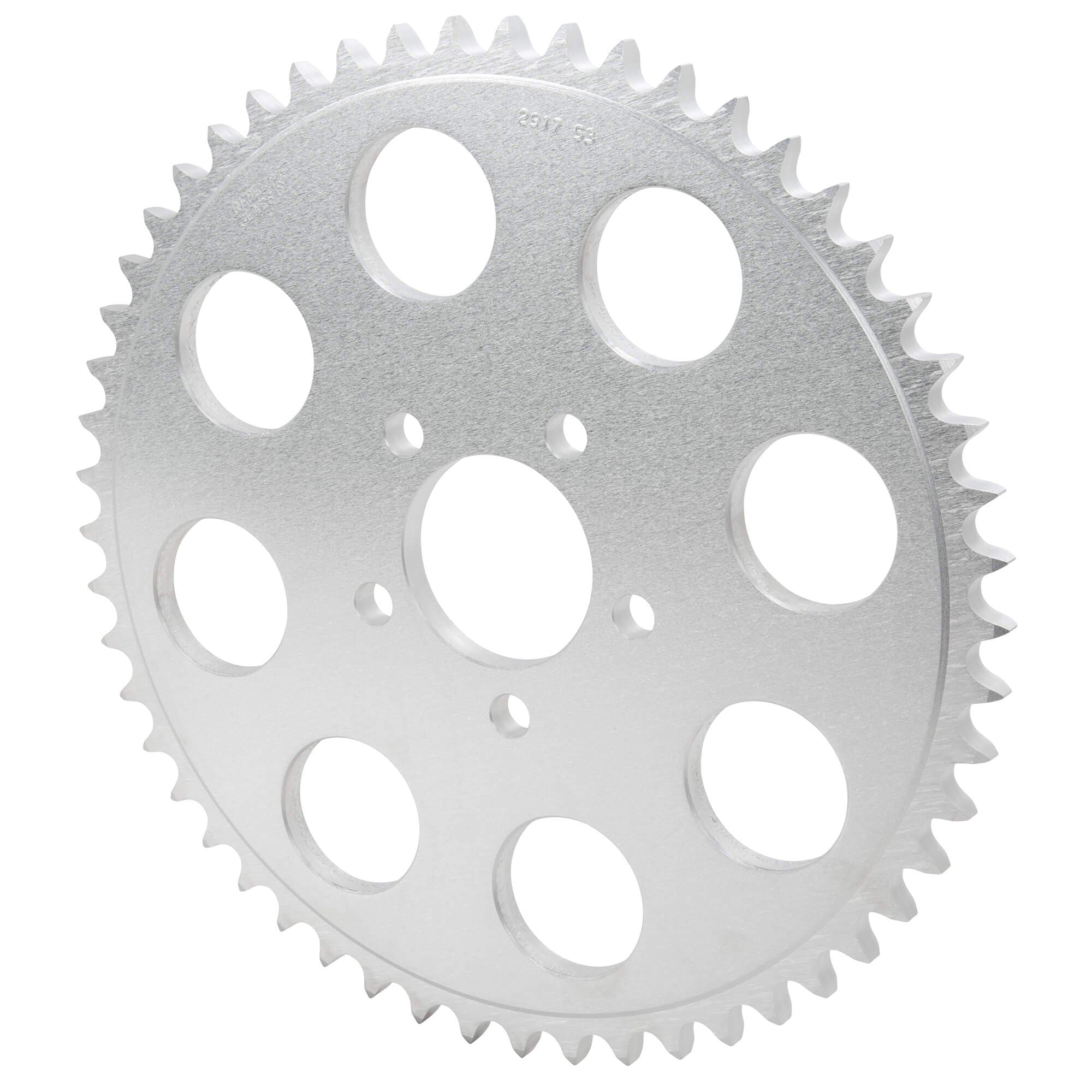 This kit is designed to match stock gearing for 2004 & up 883 Sportsters. The countershaft (front) sprocket is 22 teeth, and the rear sprocket is 53 teeth, for a 2.41:1 gearing ratio. This means that the countershaft sprocket rotates 2.41 times to spin the rear sprocket one full revolution. The less times the countershaft sprocket has to rotate, the taller the gearing, meaning less power off the line but better high-speed cruising. The rear sprocket has a 2.214 inch diameter center hole to properly fit 2004 and later H-D 883 Sportsters.
