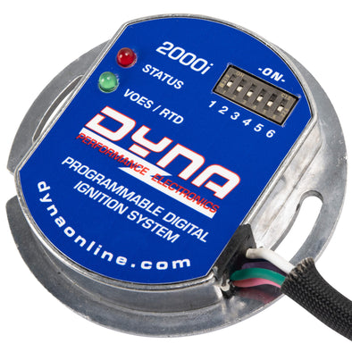 NOTE: To install a 2000i on a kick start motors will require reprogramming the dead revs back to zero (0). Out of the box, the 2000I has 3 dead revs like a stock Harley-Davidson System. This is also a benefit for high compression motors using an electric starter. The kick must not start on the compression stroke (sensor in the window on the cup). Stopping ‘in the window’ will execute the soft turn off. The leading AND trailing edges of the window must be seen by the 2000i to make a spark. That will require a harness to reprogram it you would need Dynatek part # DIPK-1 to reprogram it