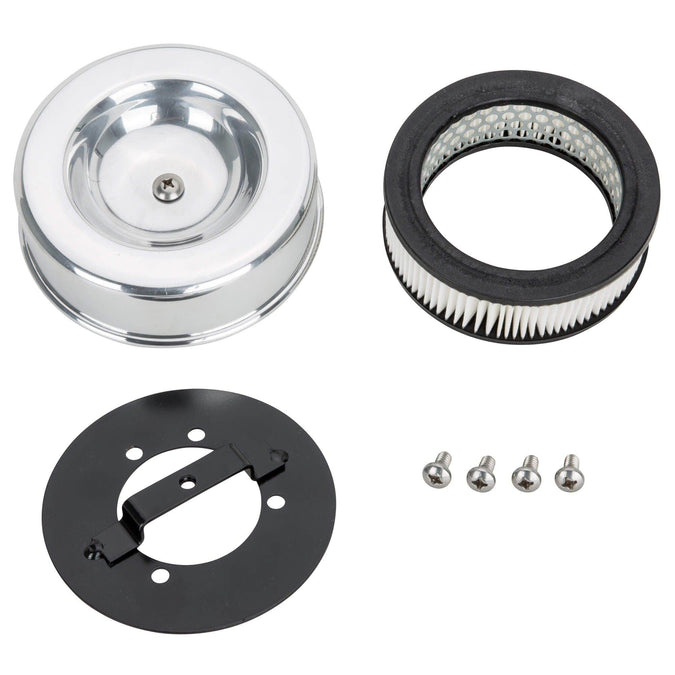 Gasbox introduces the new Dog Dish Air Cleaner. This air cleaner features a hand spun polished aluminum cover with a high quality element for high flow as well as superior protection from dust and dirt. This kit also includes a black powder backing plate and all necessary mounting hardware. A perfect fit on 1991-2019 Harley-Davidson motorcycles with a CV carburetor of EFI (Electronic Fuel Injection). Diameter of Cover is 5-3/8". Made in Cleveland, Ohio USA.